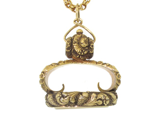 If the full on watch fob necklace is too Grande Dame for you (and not to mention too expensive...lots of gold weight in that necklace), here's the younger version with a single fob pendant on an antique chain.