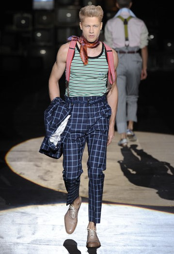 ...And here's mine: Taking an amateur page from the sartorial genius that is Ed Hardy, Vivienne Westwood has done it again. From toupees, spray tans, and suspenders on the androgynous models, to the neck scarves--that we speculate will be used for strangling purposes post show,-- fine tailored checkered cropped suits and drop crotch trousers, if this collection isn't a clear indication that a man close to Westwood fucked her and never called, we don't know what is.